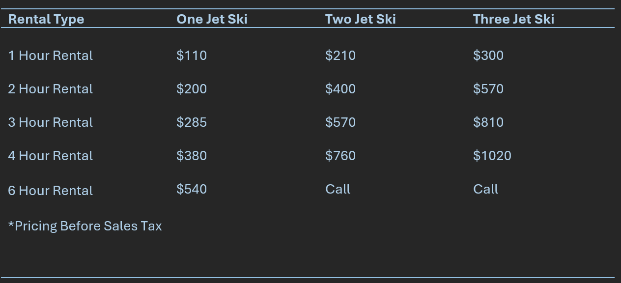 A pre-authorization of $500 per jet ski is required before your rental as a deposit